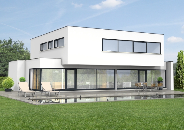 Das Haus Juli ist eine elegnate Bauhausvilla. Während das Erdgeschoss als Rechteck geplant ist, ist das Obergeschoss quadratisch. Dadurch ergeben sich sowohl im Terrassen- als auch im Eingangsbereich Überhänge, die dem Entwurf Spannung verleihen. Dieser Kontrast zwischen Erd- und Obergeschoss wird noch dadurch betont, dass im EG die gesamte Gartenfront verglast ist. Im OG kontrastiert das aussermittig liegende Lichband, das die gesamte Breite des elterlichen Schlafzimmers einnimmt.