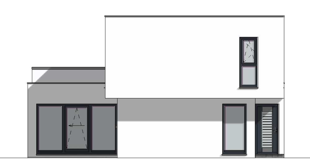 Zur Strasse hin wird der Entwurf durch große Festvergalsungen strukturiert, der Überstand des Obergeschosses wird als Wind- und Regenschutz für den Hauseingang genutzt.