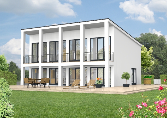 Beim Pultdachhaus ist immer die Gartenseite betont. Hier erhält die Fassade eine klare Gliederung durch vier jeweils gleich große 3-flg. Türen, die gleichmäßig in der Fassade gesetzt sind. Der Große Balkon wird durch fünf Stützen getragen, die diese Einteilung 1:1 aufnehmen. Die bei Pultdachhäusern häufige "hohe Stirn" über den Fenstern im Dachgeschoss gibt es hier nicht. Das liegt an der Überhöhe der Fenster im Dachgeschoss, die das Dach optisch niedriger scheinen lassen.