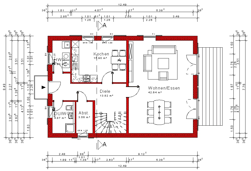 Die komplette Planung(Grundrisse, Ansichten, Schnitte, Bautragspläne), Mengenberechnung, Kalkulation und Visualisierung dieses Hauses wurde erstellt mit der Software Bauset-Hausplaner.