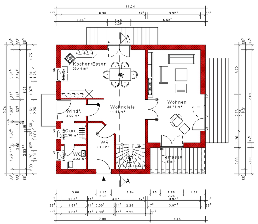 Die komplette Planung(Grundrisse, Ansichten, Schnitte, Bautragspläne), Mengenberechnung, Kalkulation und Visualisierung dieses Hauses wurde erstellt mit der Software Bauset-Hausplaner.