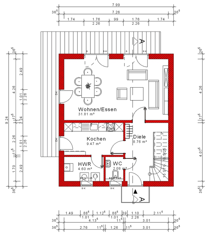 | Erdgeschoss | Wohnen/Essen | 31,8 m² | ||